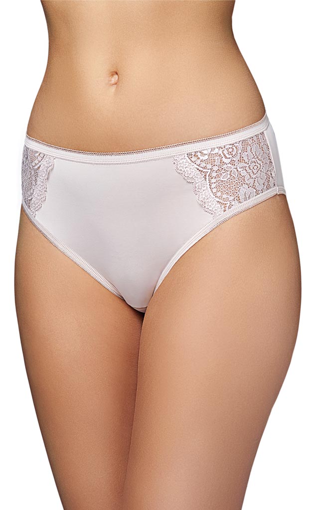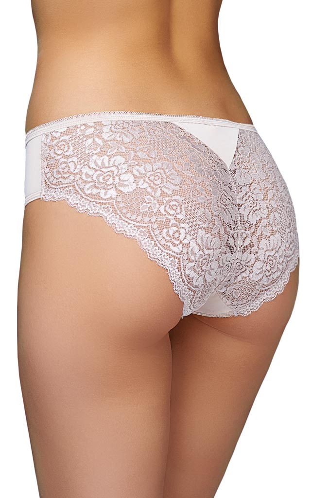 Трусы классические со средней посадкой. Передняя деталь из полиамидного микроволокна. Задняя деталь кружевная, с треугольной вставкой. Пояс обработан эластичной тесьмой. За счёт ажурных нижних срезов на задней детали модель прекрасно подходит под облегающую одежду.