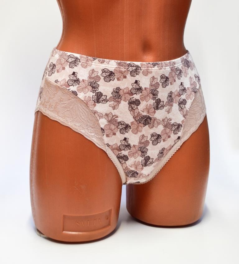 Трусы с высокой линией талии. Передняя деталь состоит из трёх частей: центральная из хлопка в виде треугольника с основанием вверху и две боковые кружевные части. Задняя деталь из хлопка. Пояс обработан швом «зигзаг». По нижнему срезу передней детали (кружевной части) эластичная тесьма с внутренней стороны, для нежного прилегания по ножке. Нижние срезы задней детали обработаны на плоскошовной машине.