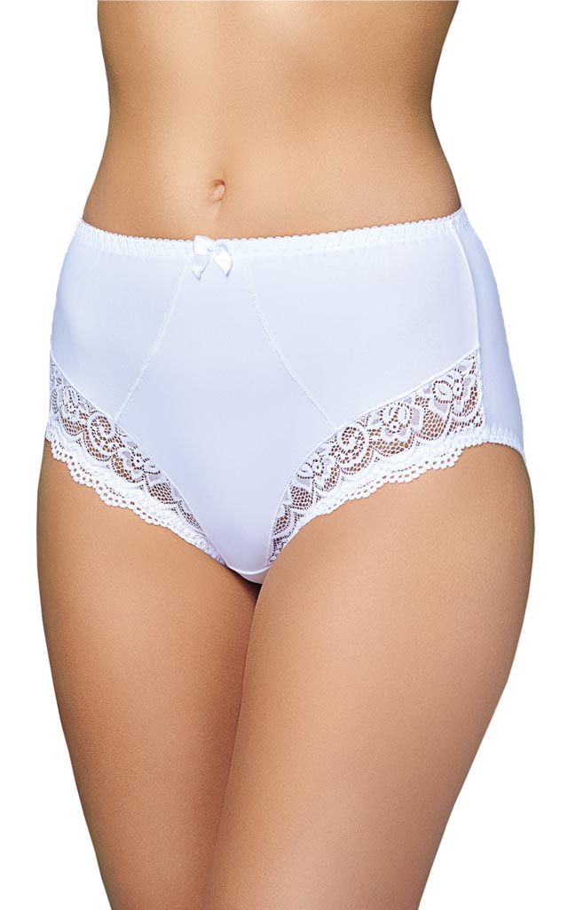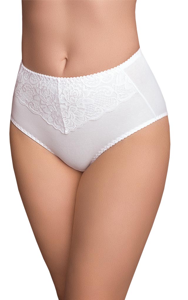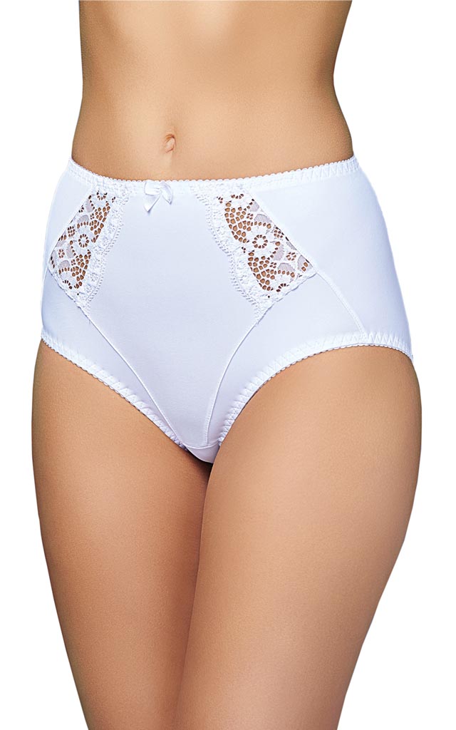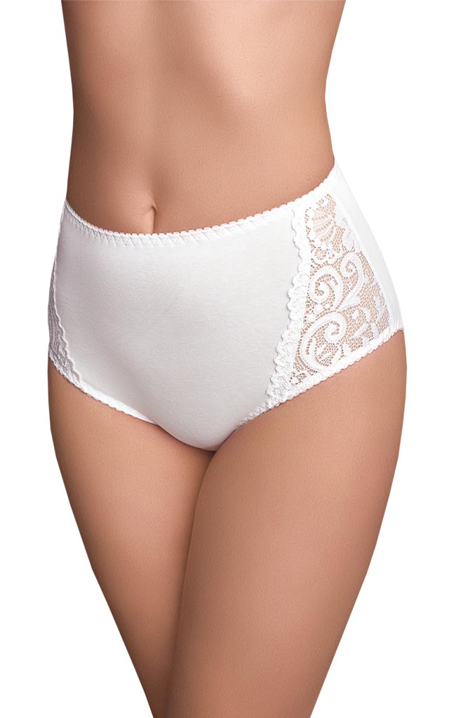 Трусы с высокой линией талии. Передняя деталь декорирована кружевными вставками. Задняя деталь полностью из хлопка. Срезы обработаны швом "зигзаг". Боковая часть достаточно высокая. Модель пользуется спросом у любительниц закрытых трусиков.