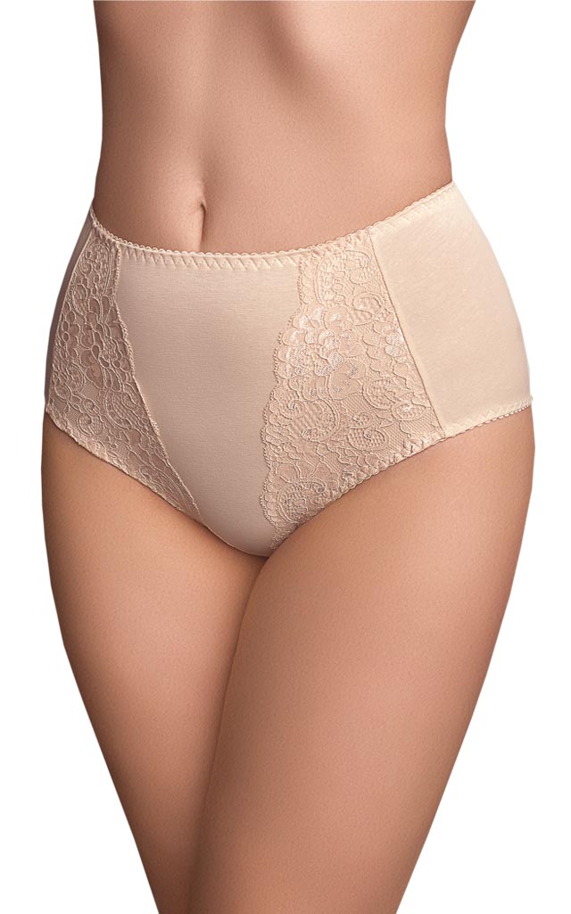 Трусы с высокой линией талии. Модель с поддерживающим эффектом. Усиливающая деталь практически полностью дублирует переднюю деталь. Боковой шов смещён на переднюю деталь. По нижнему срезу передней детали небольшая кружевная вставка. Срезы обработаны швом "зигзаг". Боковая часть достаточно высокая. Задняя деталь из хлопка.