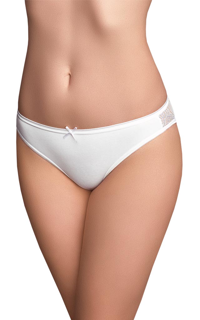 Трусы – слип с низкой посадкой. Модель из хлопка с небольшими кружевными вставками по бокам, переходящими на заднюю часть изделия. Передняя деталь украшена бантиком. Отличный выбор на каждый день.