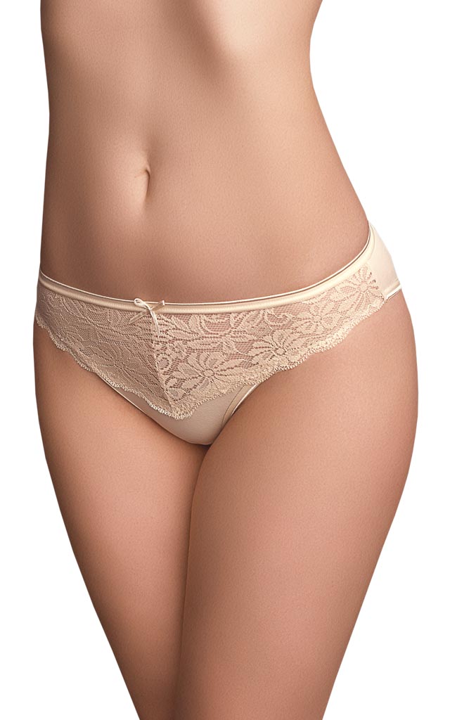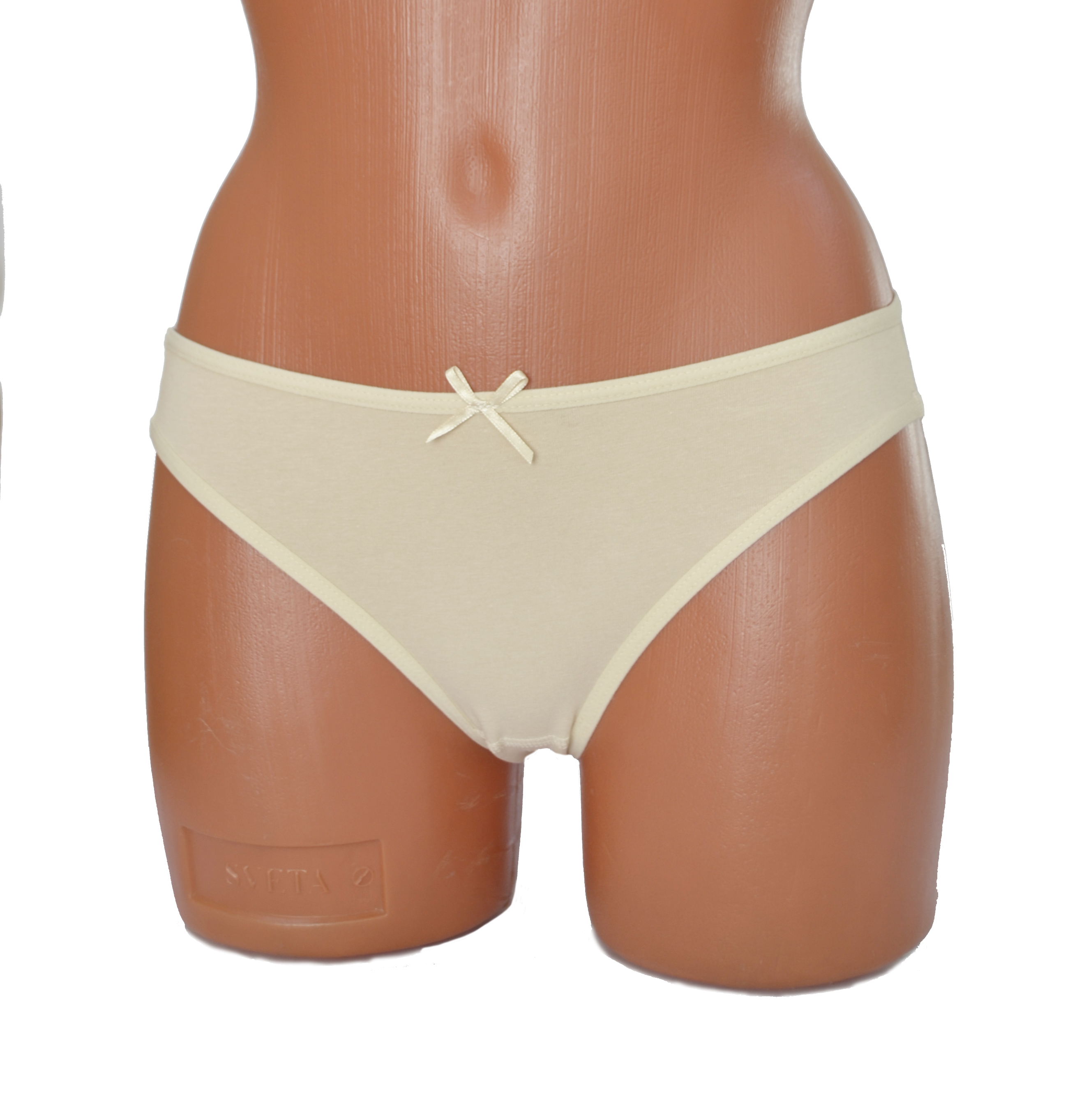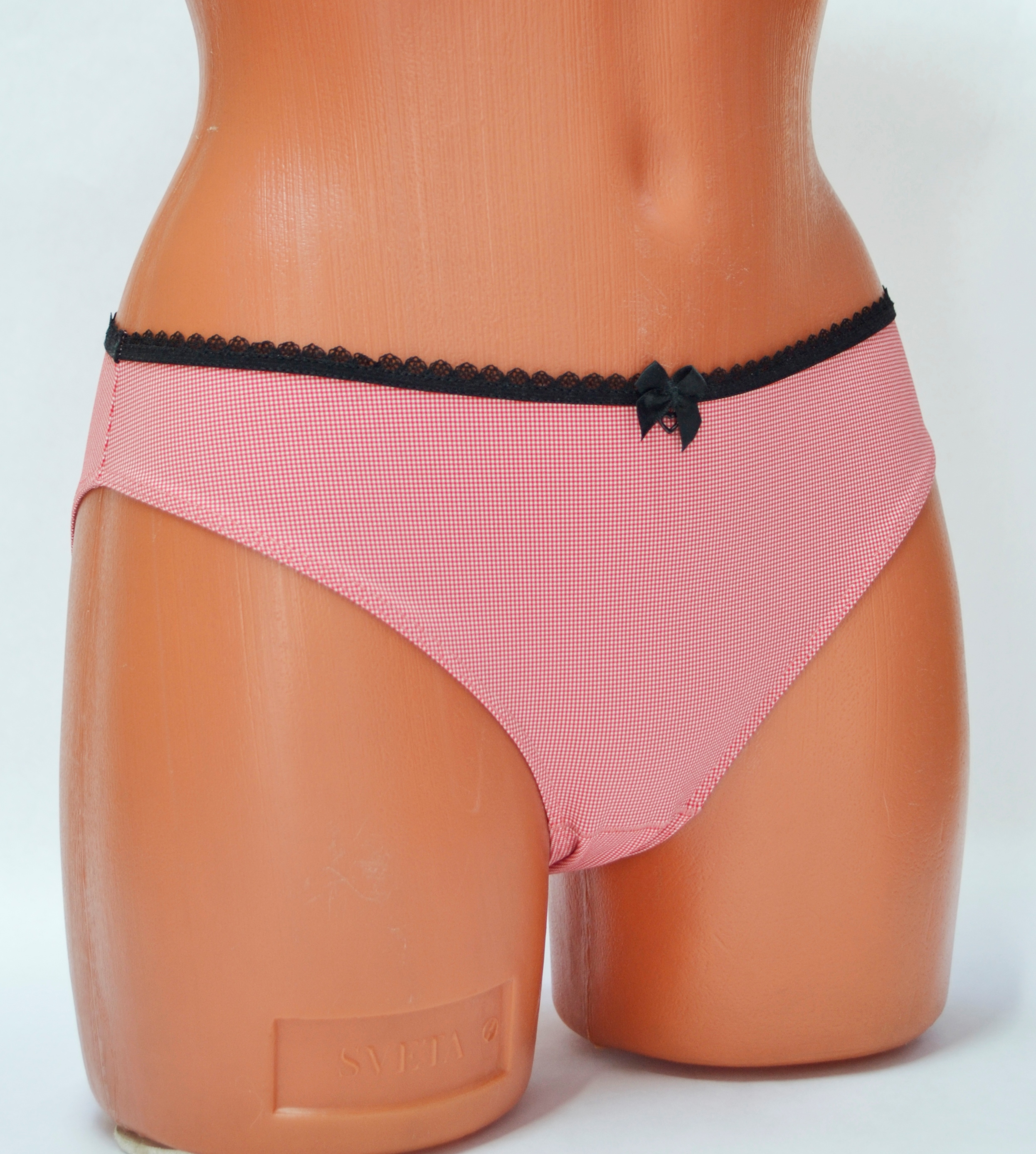 Трусы – слип. Средняя линия талии. Передняя деталь с кружевной вставкой и бантиком. Срезы обработаны эластичным кантом.
