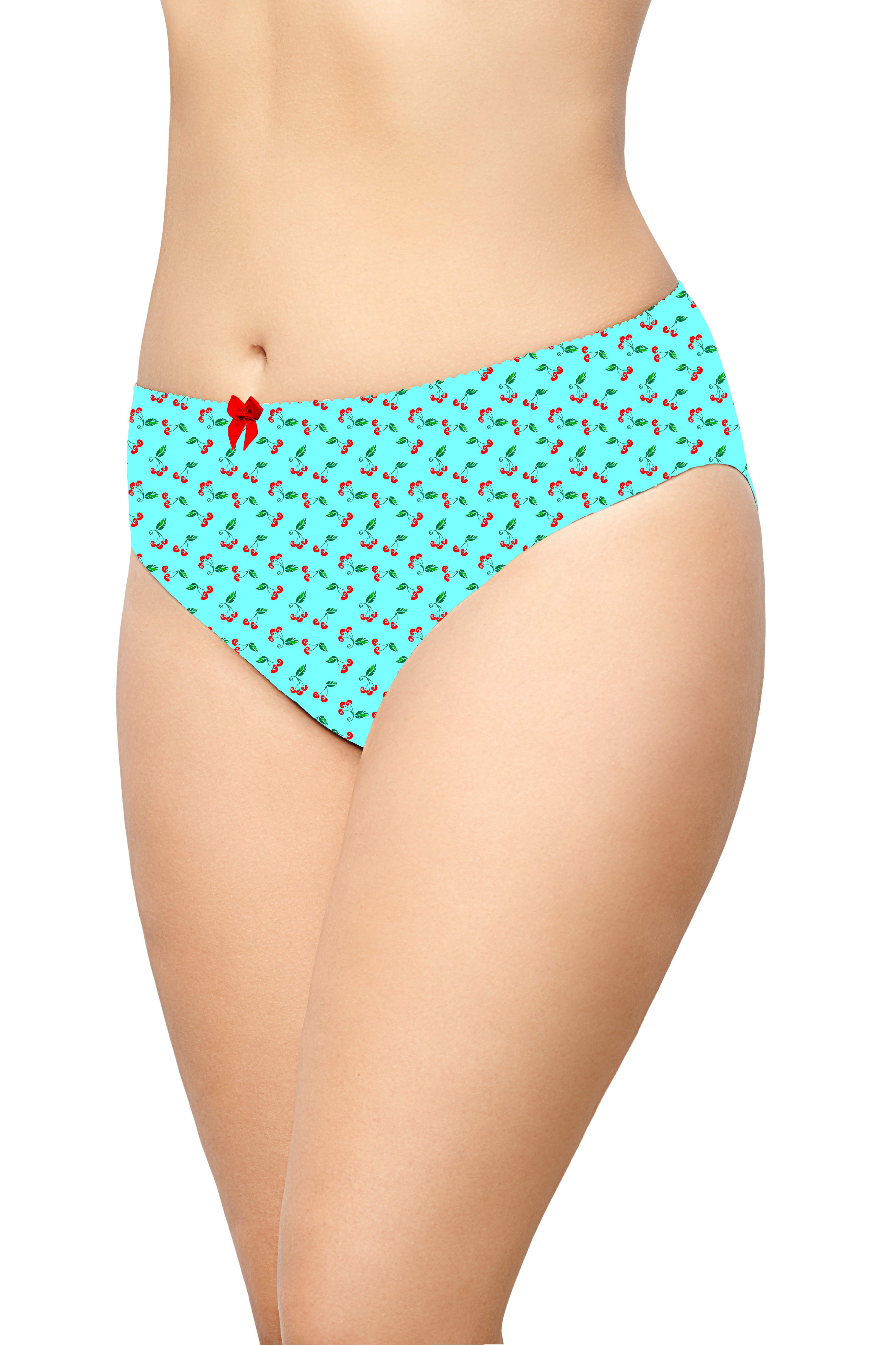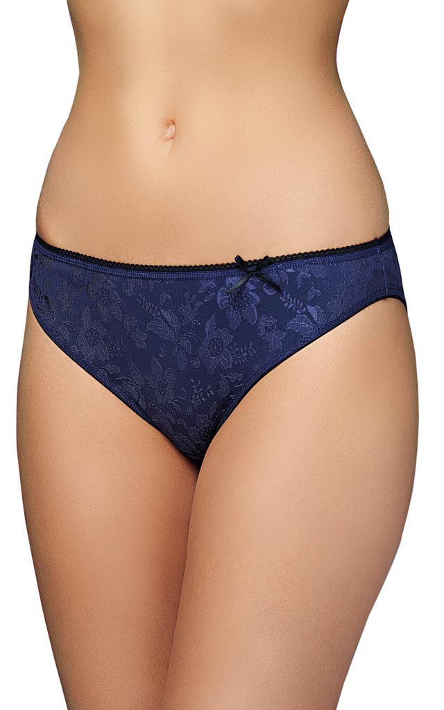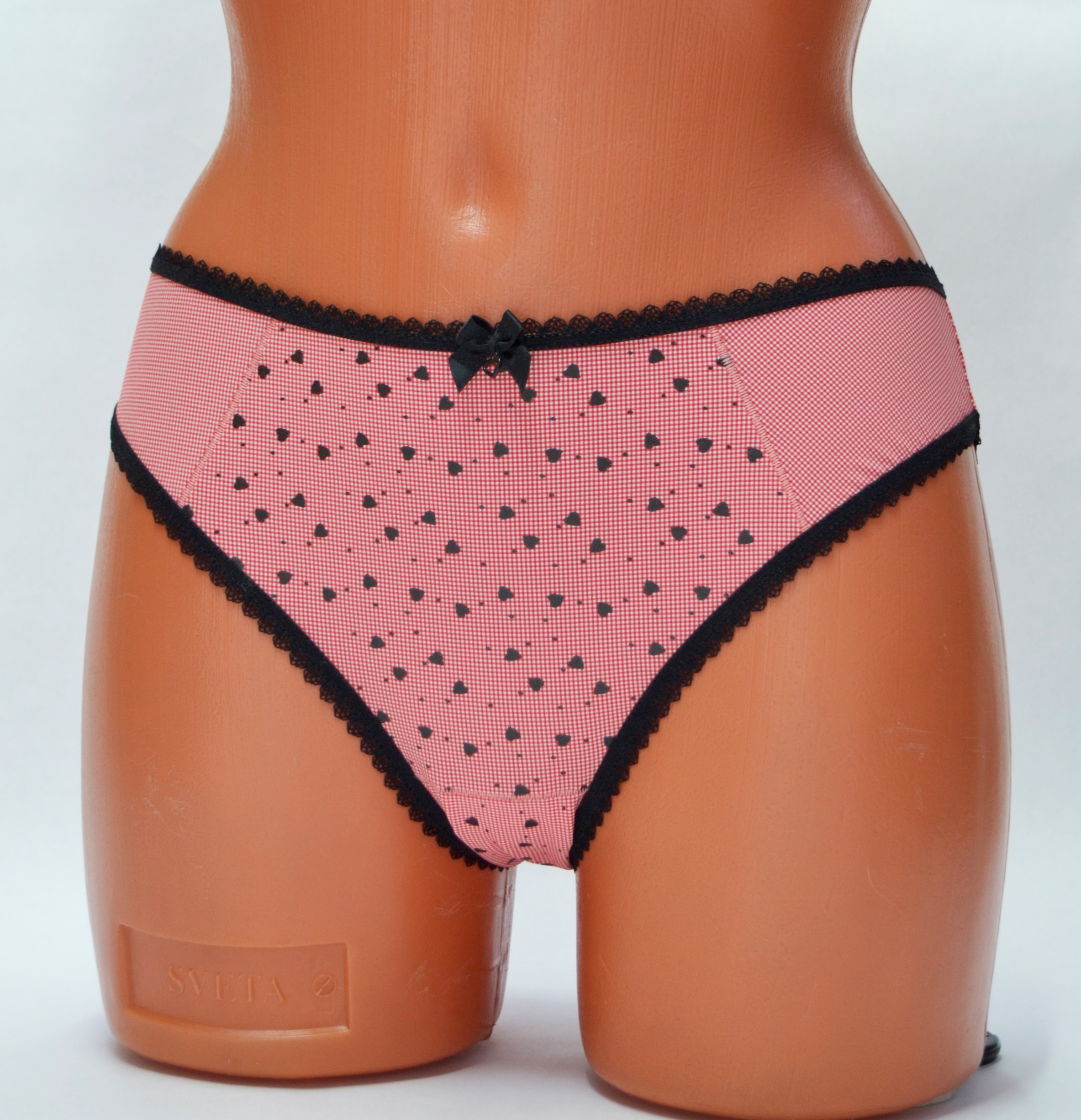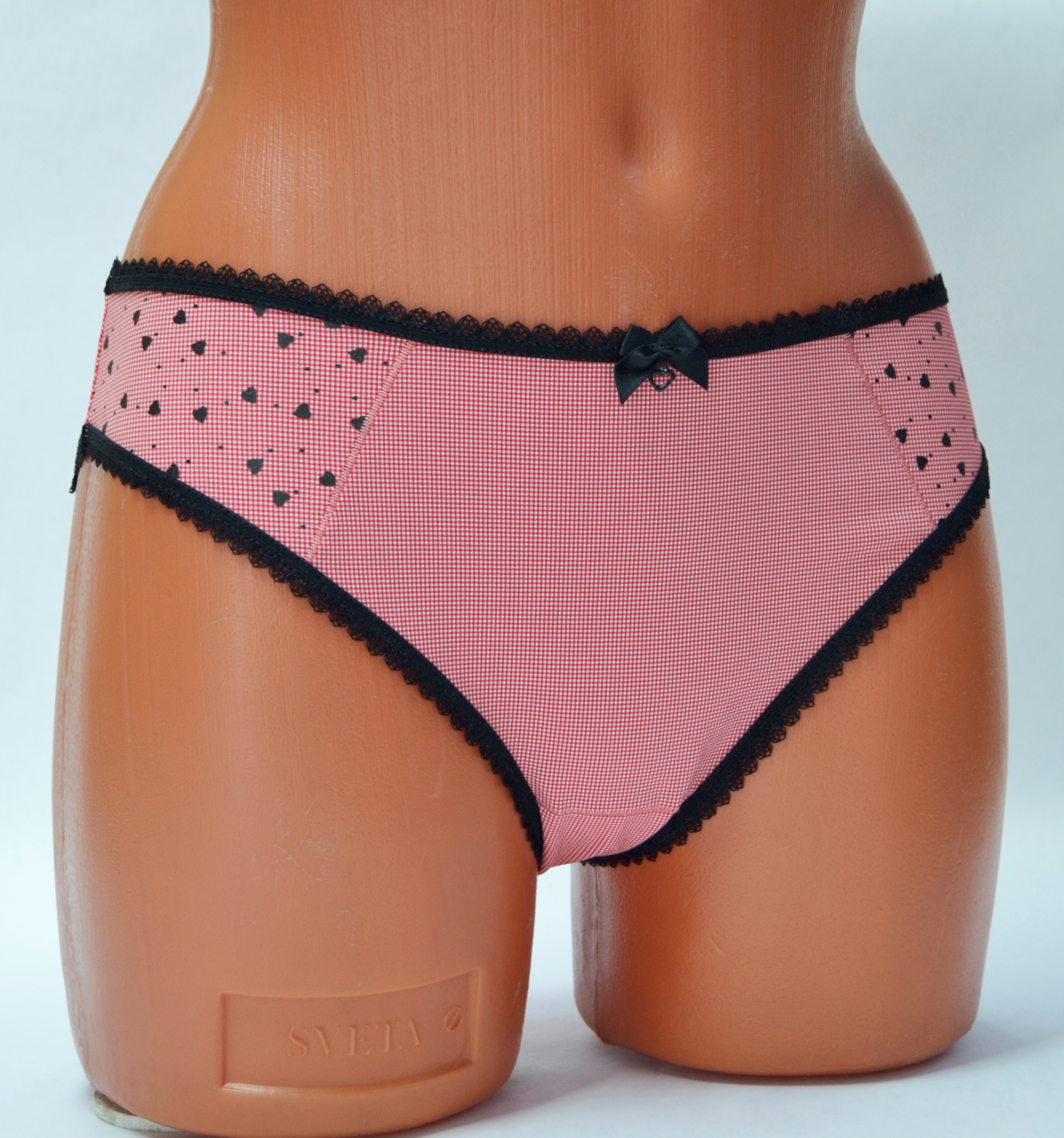 Трусы – слип. Средняя линия талии. Передняя деталь с кружевной вставкой и бантиком. Срезы обработаны эластичным кантом.