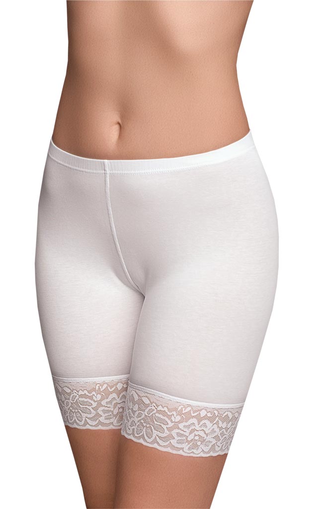 Удлинённые панталоны с высокой линией талии. Низ изделия украшает широкое кружево с цветочным рисунком, за счёт чего модель выглядит нарядно.