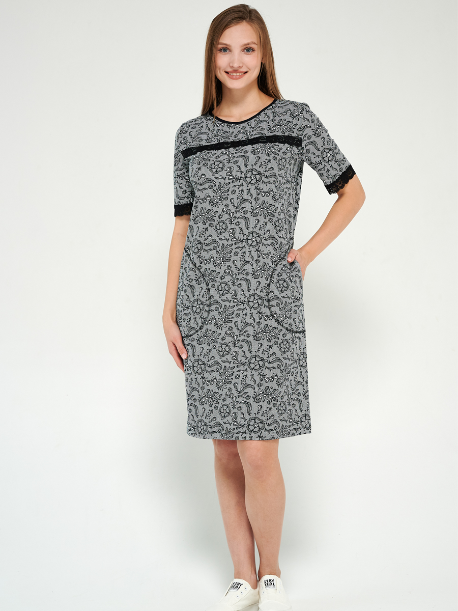 Стильное домашнее платье из принтованного хлопка качества пенье с добавлением эластана. Модель свободного силуэта с функциональными карманами и кружевной отделкой. Комфортно в носке. Позволяет в домашней обстановке выглядеть стильно и женственно.