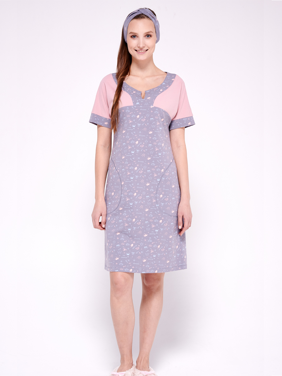 Стильное комбинированное домашнее платье. Модель свободного силуэта с функциональными карманами. Комфортно в носке. Позволяет в домашней обстановке выглядеть стильно и женственно. Модель дополнена повязкой на голову.