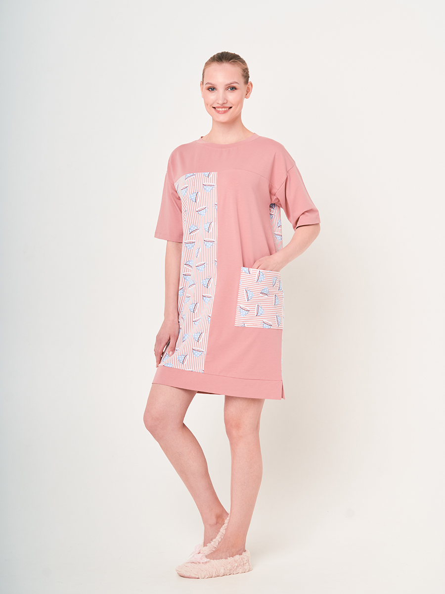Стильное комбинированное домашнее платье, с функциональными карманами. Комфортно в носке. Позволяет в домашней обстановке выглядеть стильно и женственно.
