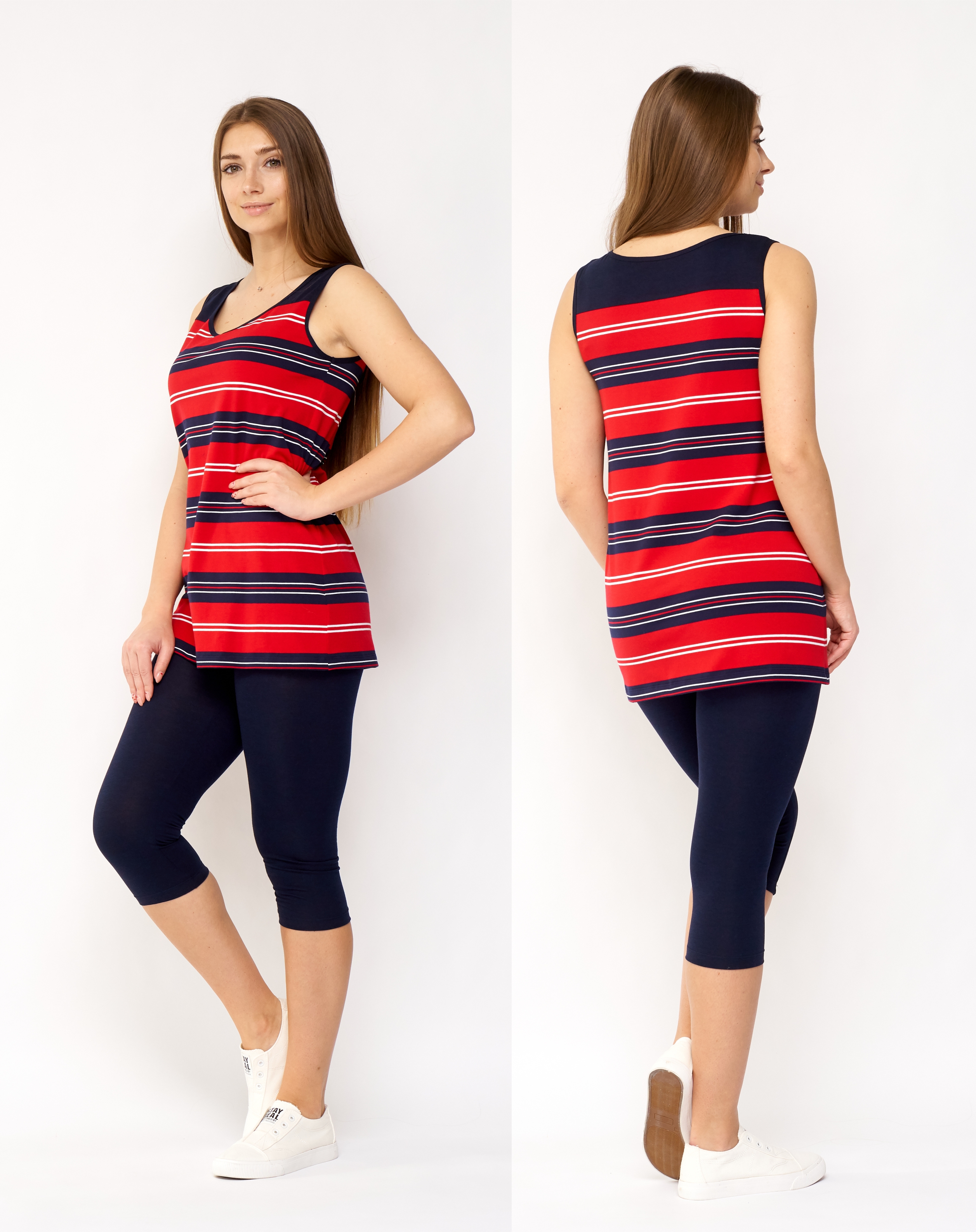 Удобный домашний костюм из принтованной ткани. Укороченные лосины с фигурным низом. Приталенная туника с оригинальной спинкой украшена ярким принтом.