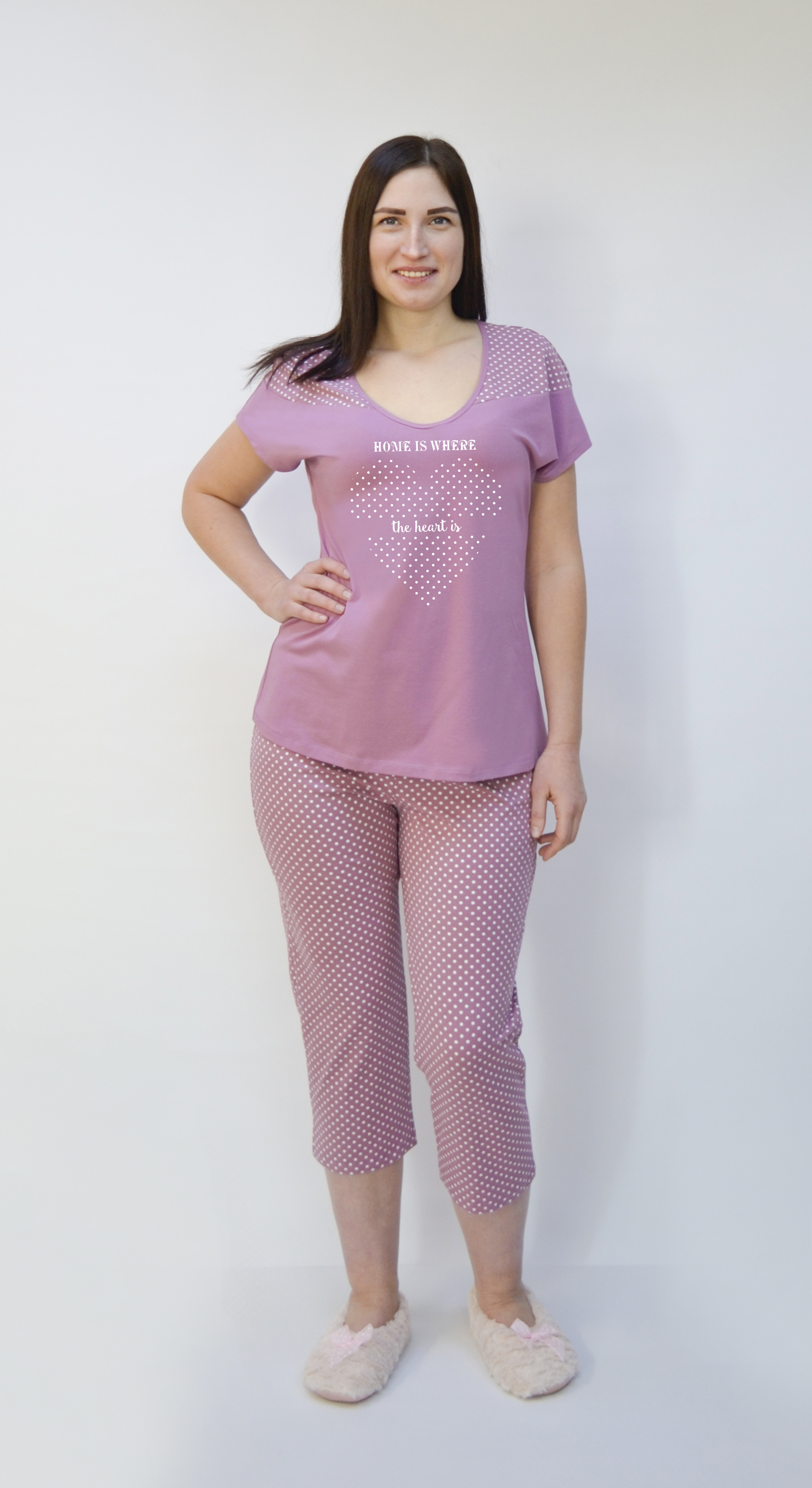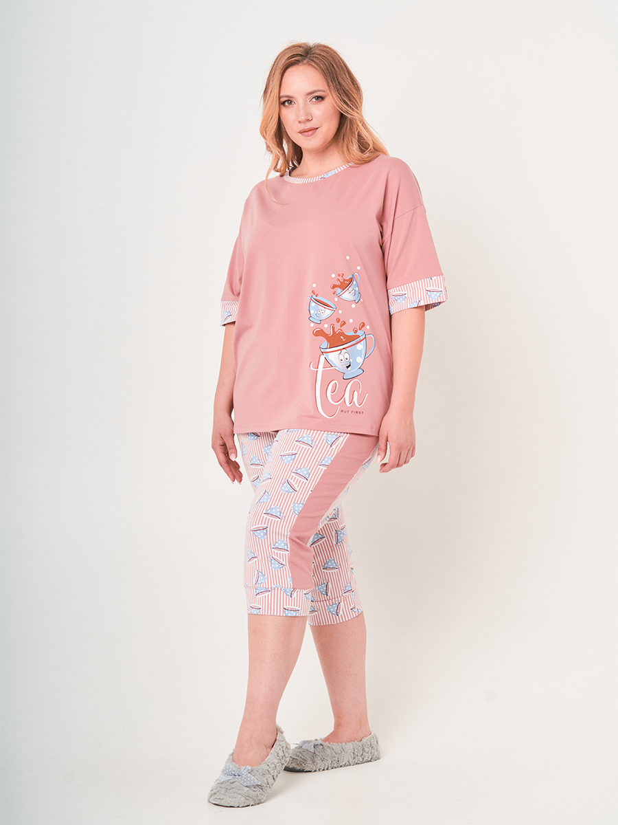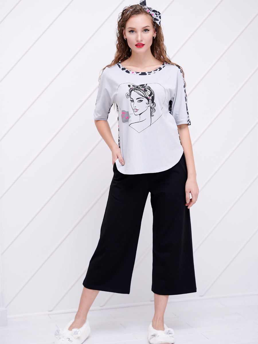 Практичный и удобный домашний костюм, состоящий из фуфайки свободного кроя и бридж. Приятный к телу, не теряет цвет и не деформируется при правильном уходе.