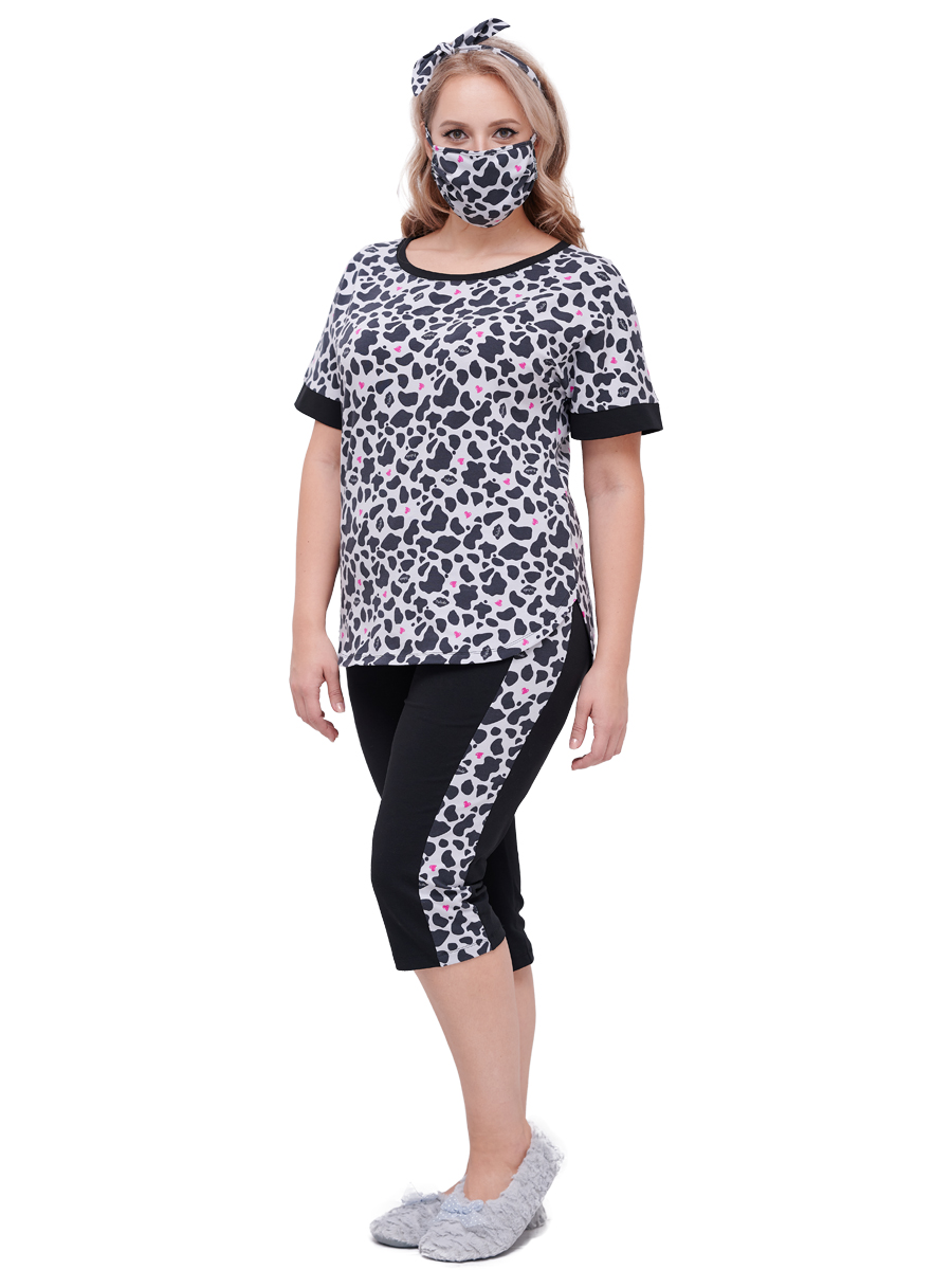 Стильный и удобный домашний костюм. Состоит из футболки и брюк- кюлотов с функциональными карманами. Футболка свободного кроя украшена стойким принтом. Костюм обеспечивает комфорт и максимальную свободу движений. Внимание! Маска защитная многоразовая в подарок к каждому комплекту.