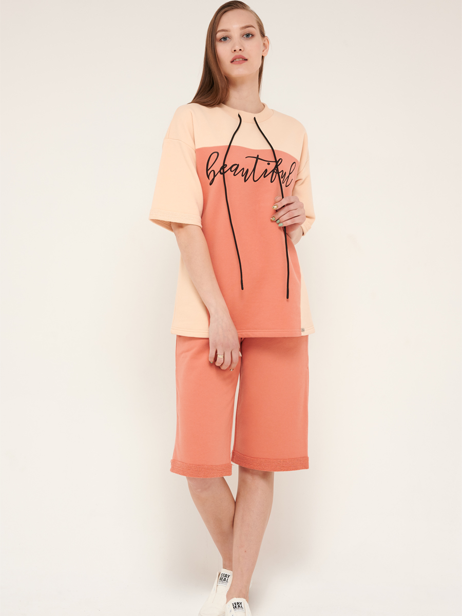 Домашний комплект, состоящий из свободной футболки на манжете и удобных шорт с карманами.
