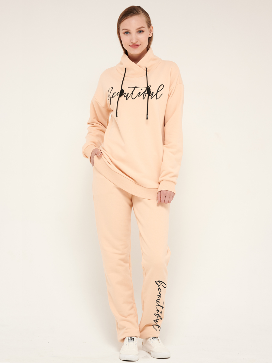 Стильный комплект из фуфайки и шорт свободного кроя в приятной комбинации бежевого цвета с персиком. Фирменные детали и стойкий принт делает это изделие уникальным. Отличный базовый костюм для любого времени года.
