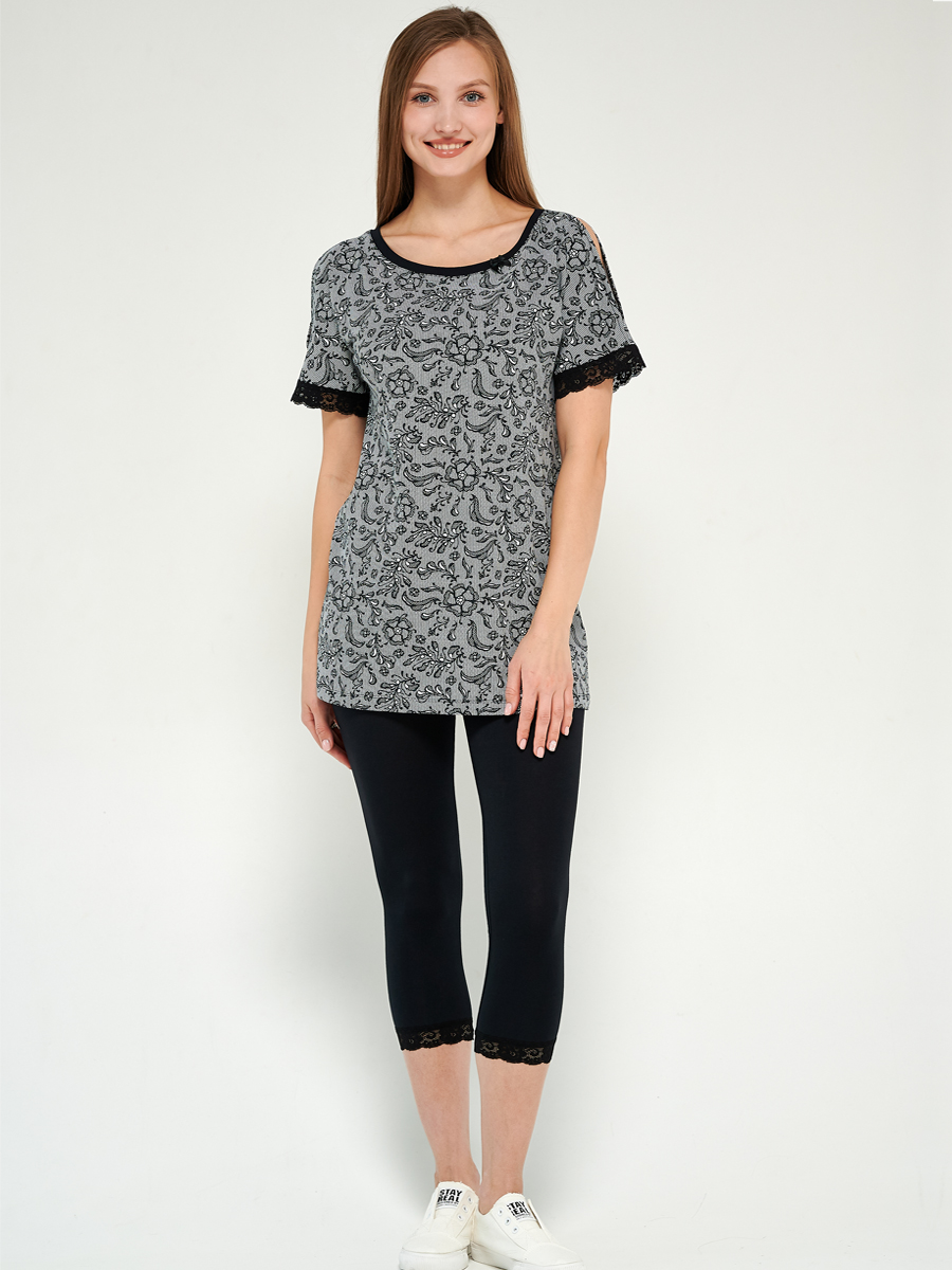 Нарядный комплект для дома и отдыха, состоящий из туники и укороченных лосин. Туника свободного кроя с разрезами по плечам, украшена кружевной отделкой. Универсальные темные лосины с удобной посадкой с кружевом по низу изделия.