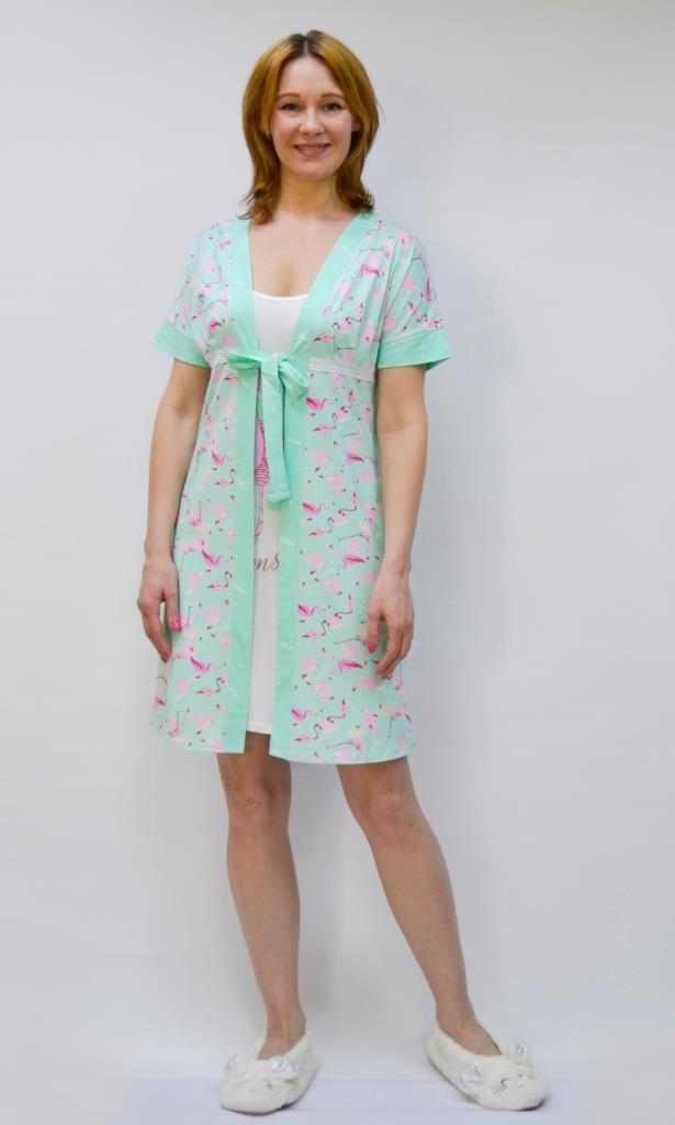 Элегантный домашний халат + сорочка на тонких бретелях из нежного принтованного хлопкового полотна. Оригинальный дизайн и яркий рисунок ткани привлекает внимание и позволяет в домашней обстановке выглядеть стильно и женственно.
