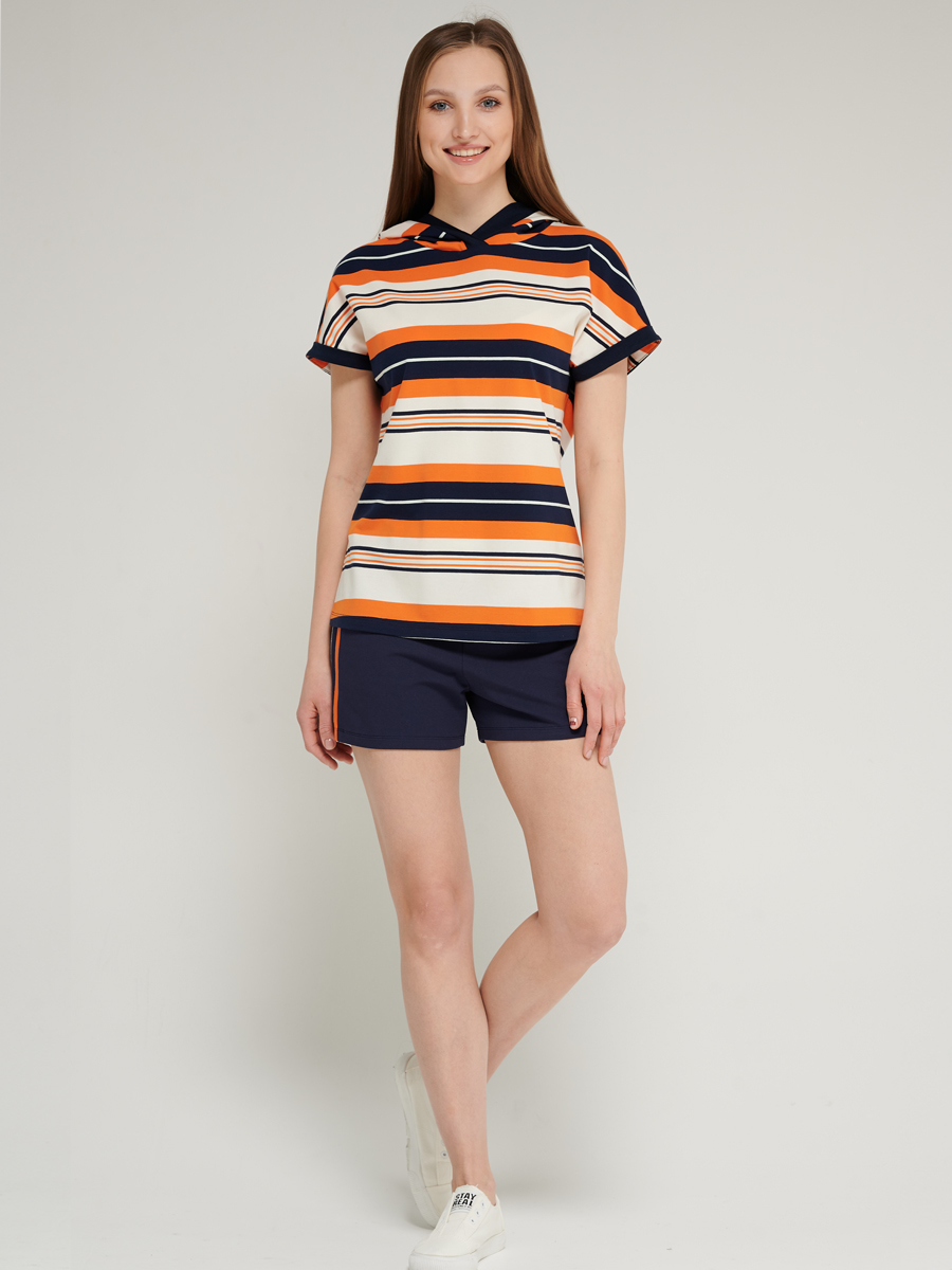 Молодежный домашний хлопковый комплект из комбинированного трикотажного полотна, состоящий из футболки с капюшоном и кокетливых шорт.